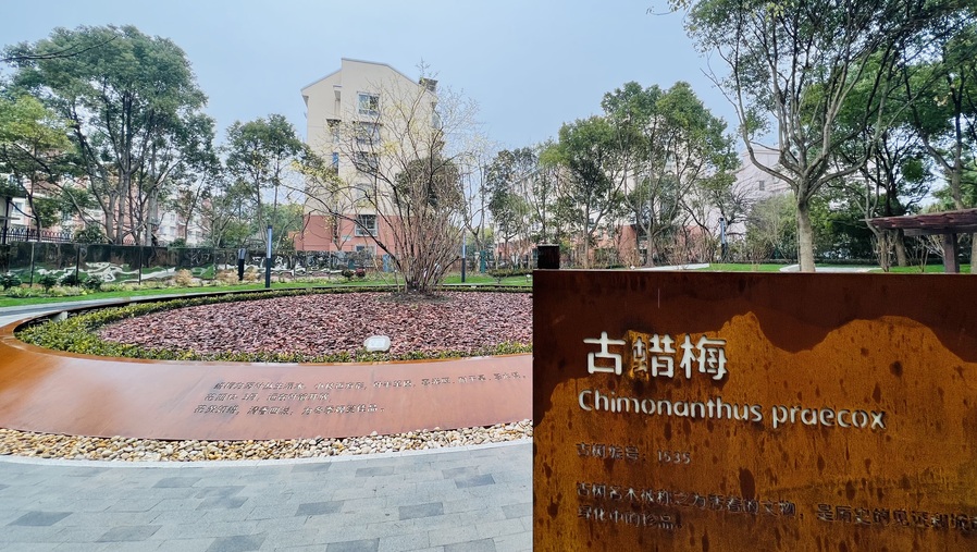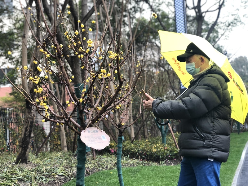 樱花路海桐路路口的古蜡梅园里,一株古树编号为1535的素心蜡梅在园中安享晚年。圆形金属花坛采用低矮却宽阔的设计,让人们和古蜡梅保持一定距离的同时,能无死角地围观。来自周边社区的“市民园长”还担任了志愿讲解员,讲述古蜡梅的前生今世,并教大家识别十几种国内外的蜡梅品种。越来越多的居民通过这种交流,对古蜡梅产生了感情,为有这样一位“老寿星”相伴而幸福。