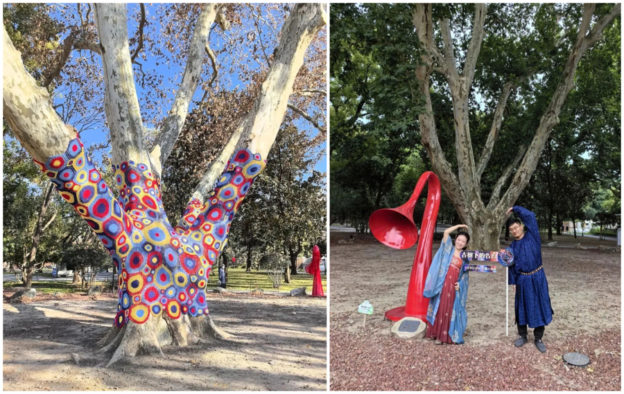 在中山公园3号门,编号0909的古悬铃木宛如巨伞。今年春节,中山公园还联合百衲布艺传承人,为古树量身定制了绚丽彩衣。 图片来源:长宁区绿化市容局
