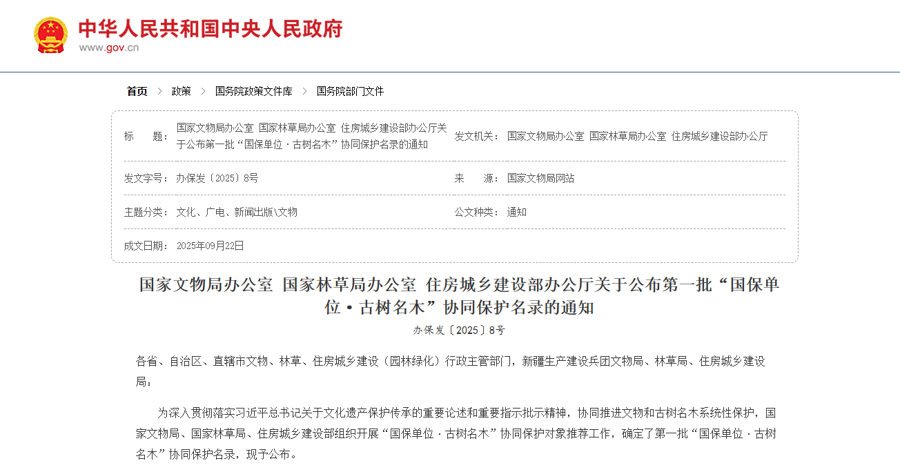 2023年11月20日,国家文物局、国家林草局、住建部联合发出《关于加强全国重点文物保护单位内古树名木保护的通知》(以下简称《通知》),要求按照法律法规要求,协同做好全国重点文物保护单位内古树名木的全面保护和科学管护。