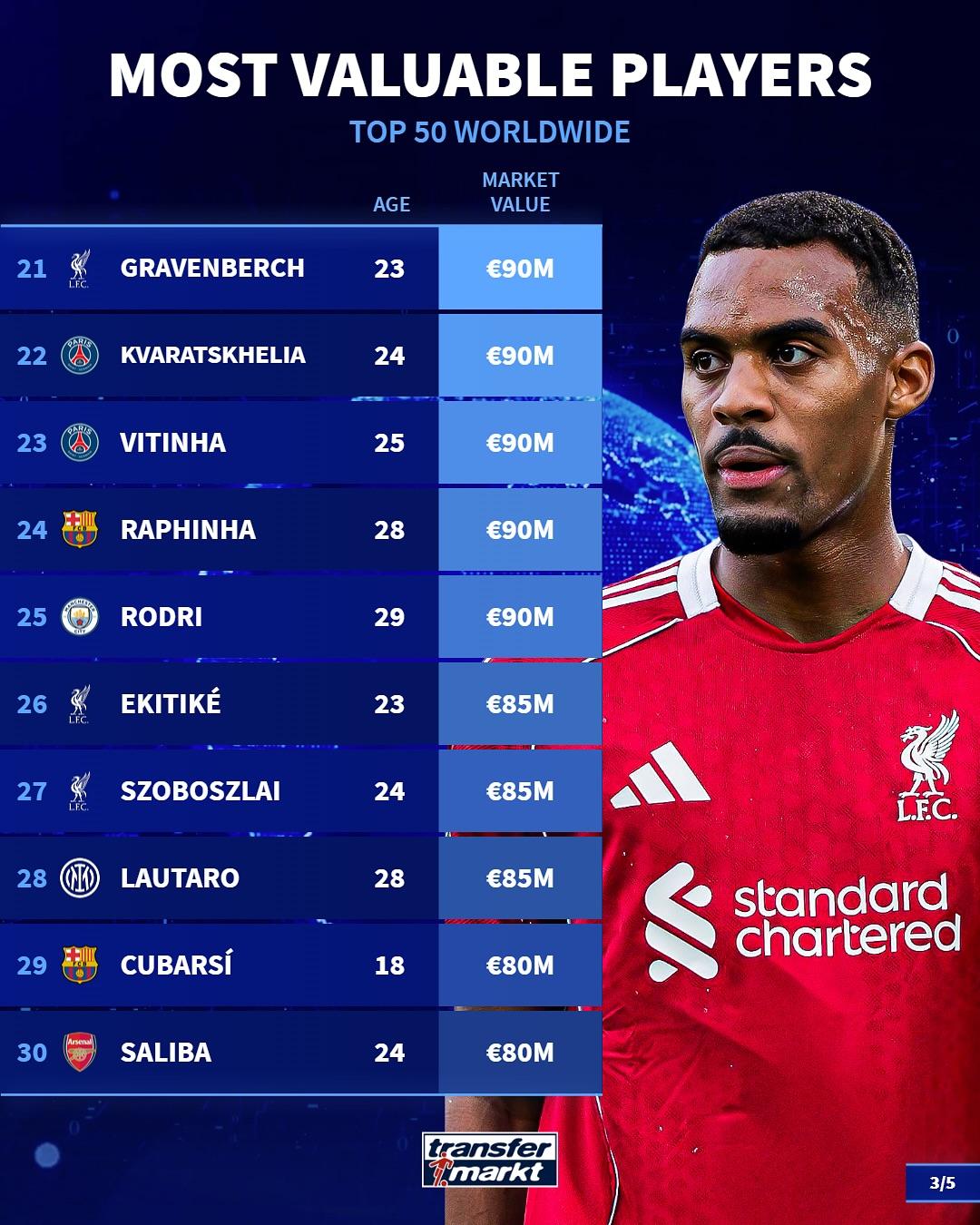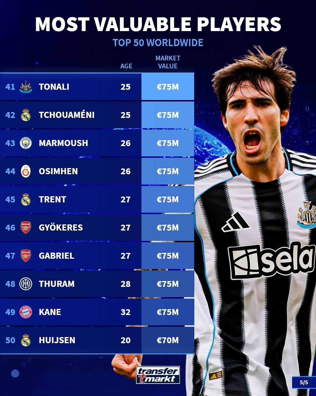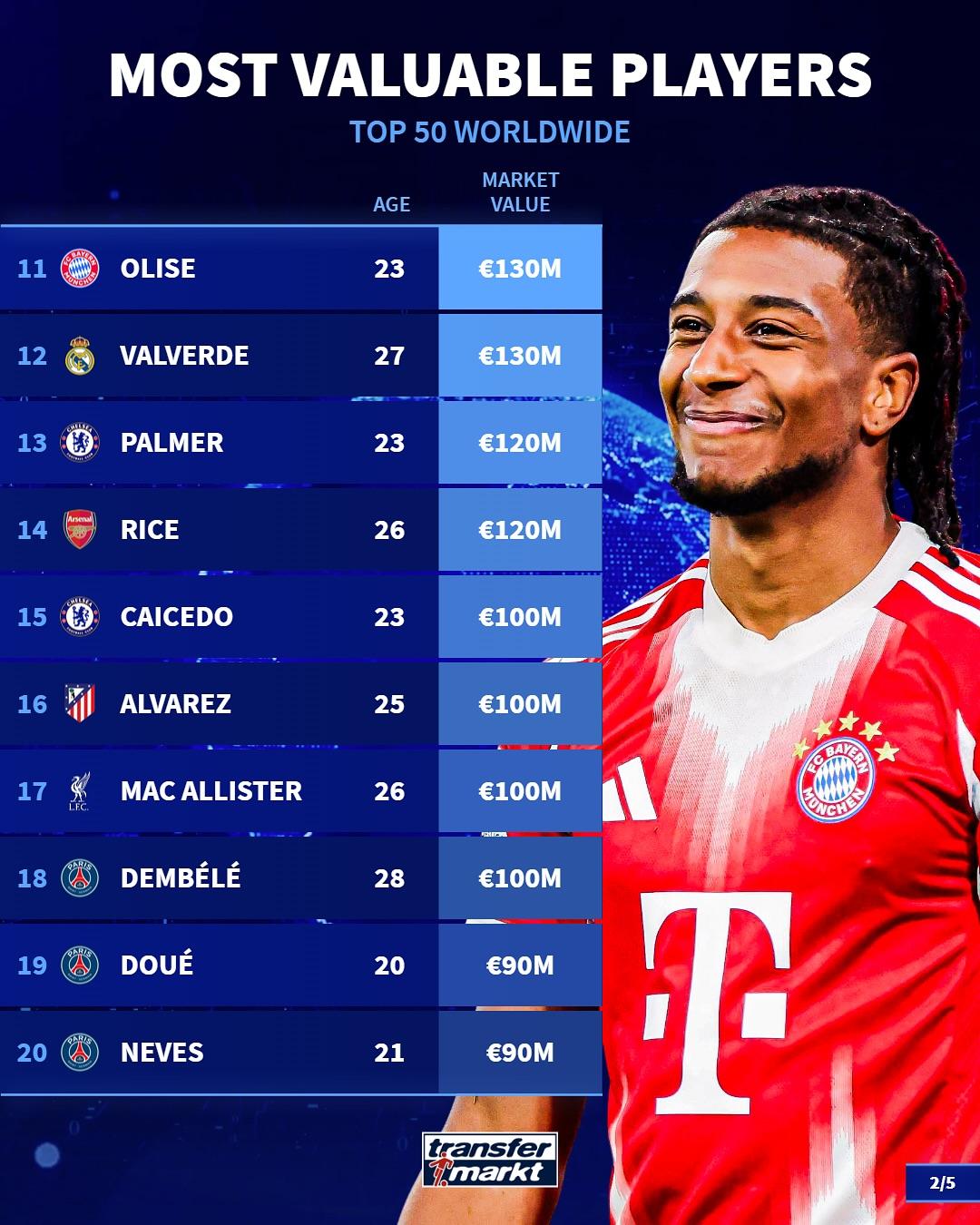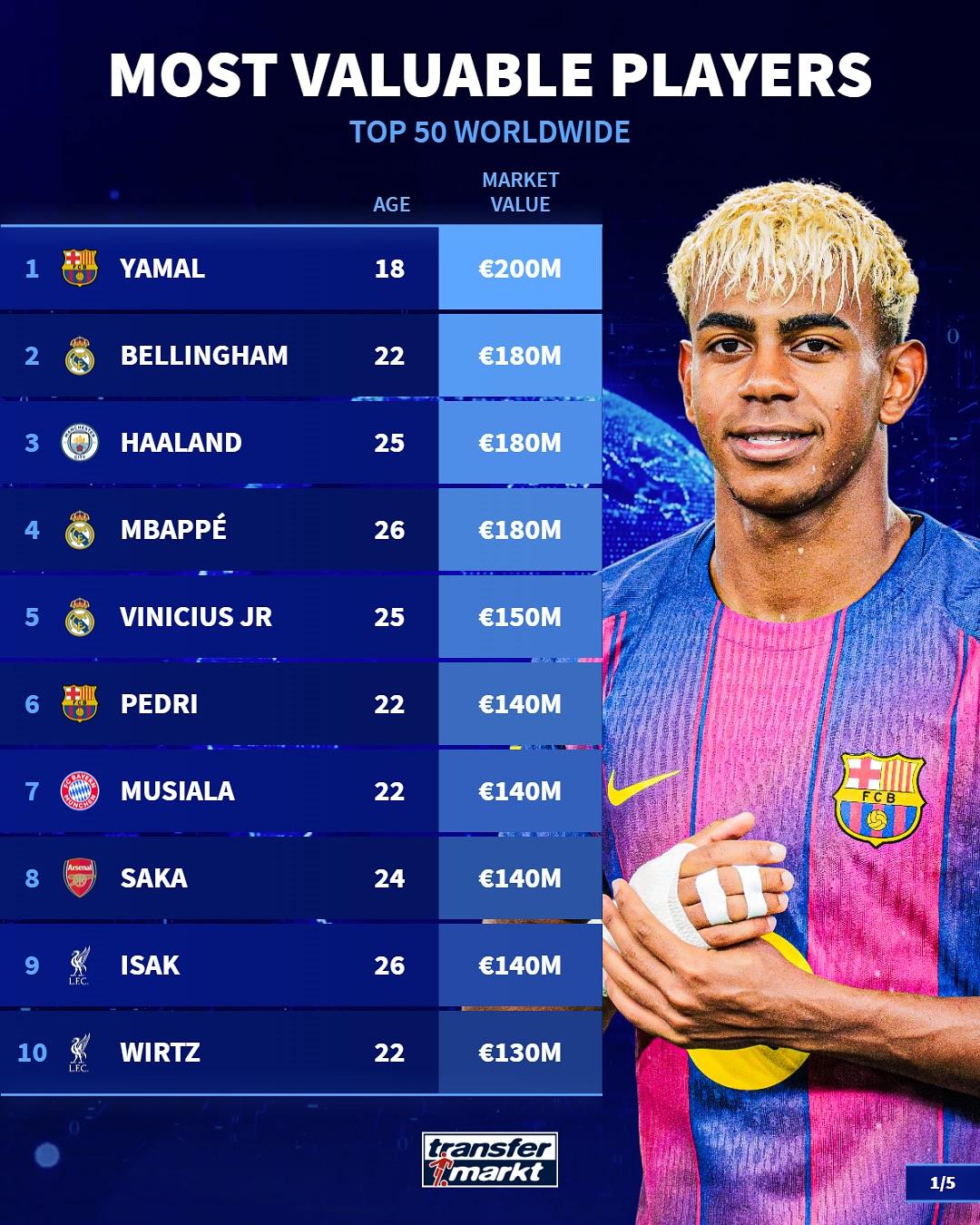 虎扑10月25日讯德国转会市场统计了当今足坛身价排名在前50的球员,详情如下:
