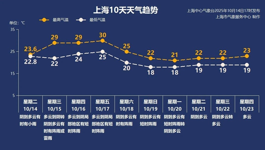 本周六前后冷空气即将抵达亿正策略,上海届时将会有一次降雨、降温和大风的天气过程,气温明显下探,周日全天仅有18℃至22℃。后续不断有冷空气补充影响,气温反弹无力。