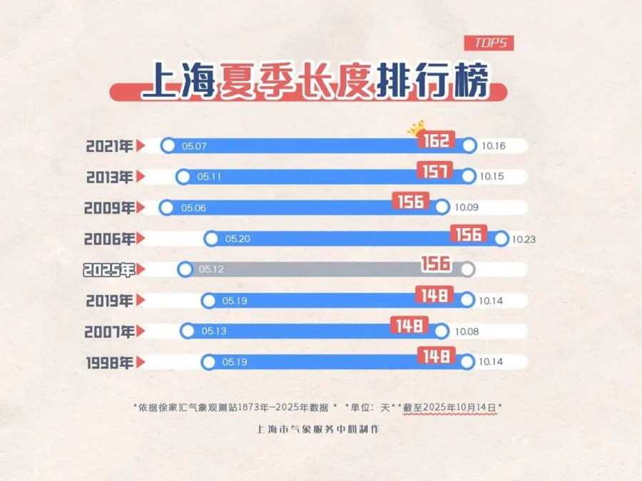 截至今天,今年夏季已长达156天,位列上海自1873年有气象记录以来夏季长度排行榜的第三位,按目前的预报趋势来看,今年可以“保二争一”,刷新榜单。